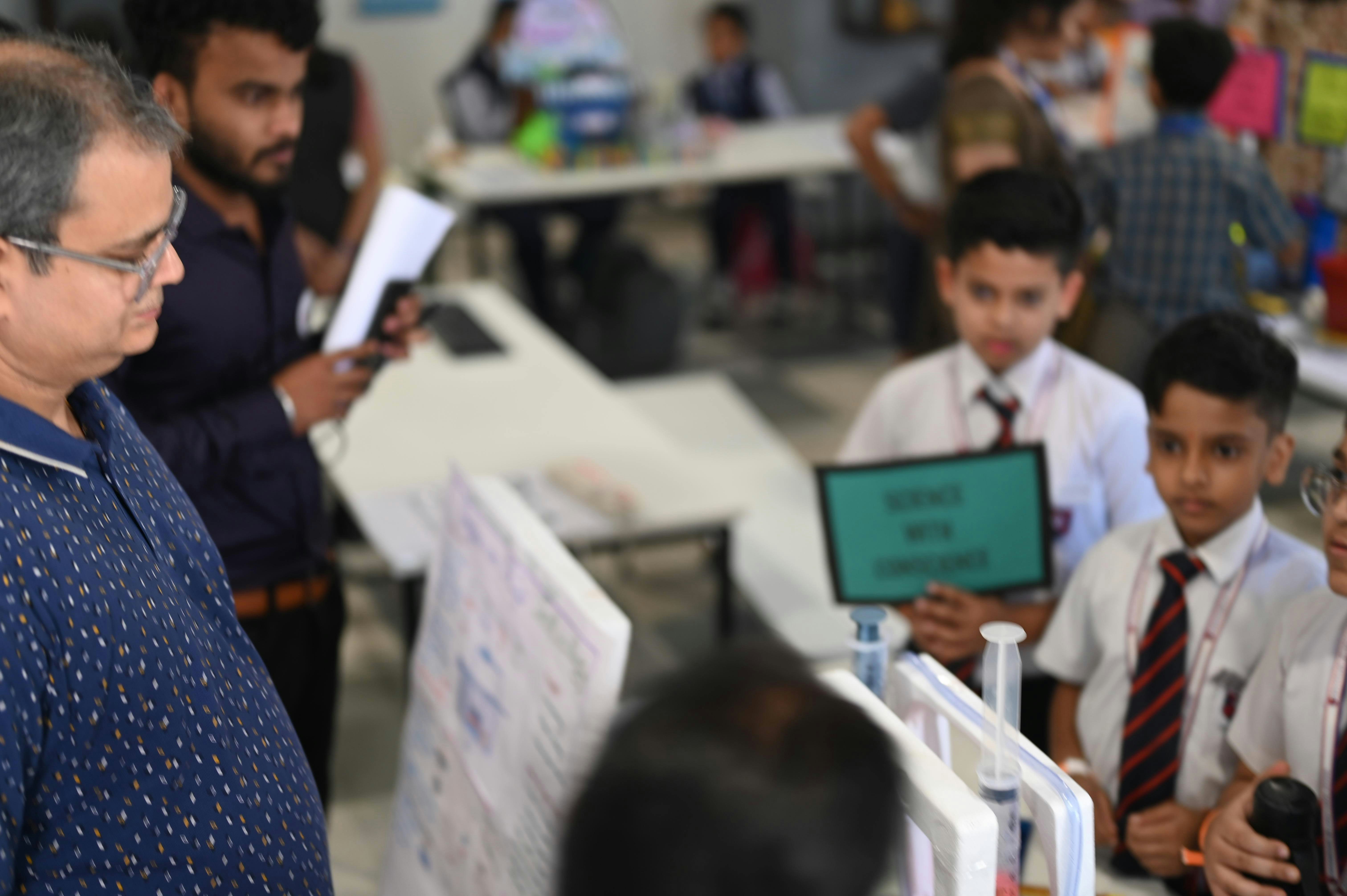 Diverse group of volunteers helping students at science fair with experiments and projects